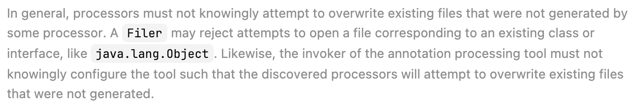 어노테이션 프로세서는 기본적으로 존재하는 파일을 덮어쓰는 것을 허용하지 않는다.