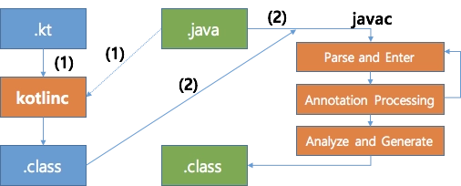 코틀린 코드 → 코틀린 컴파일러 → .class 파일 생성 → java 코드 컴파일 과정 진행