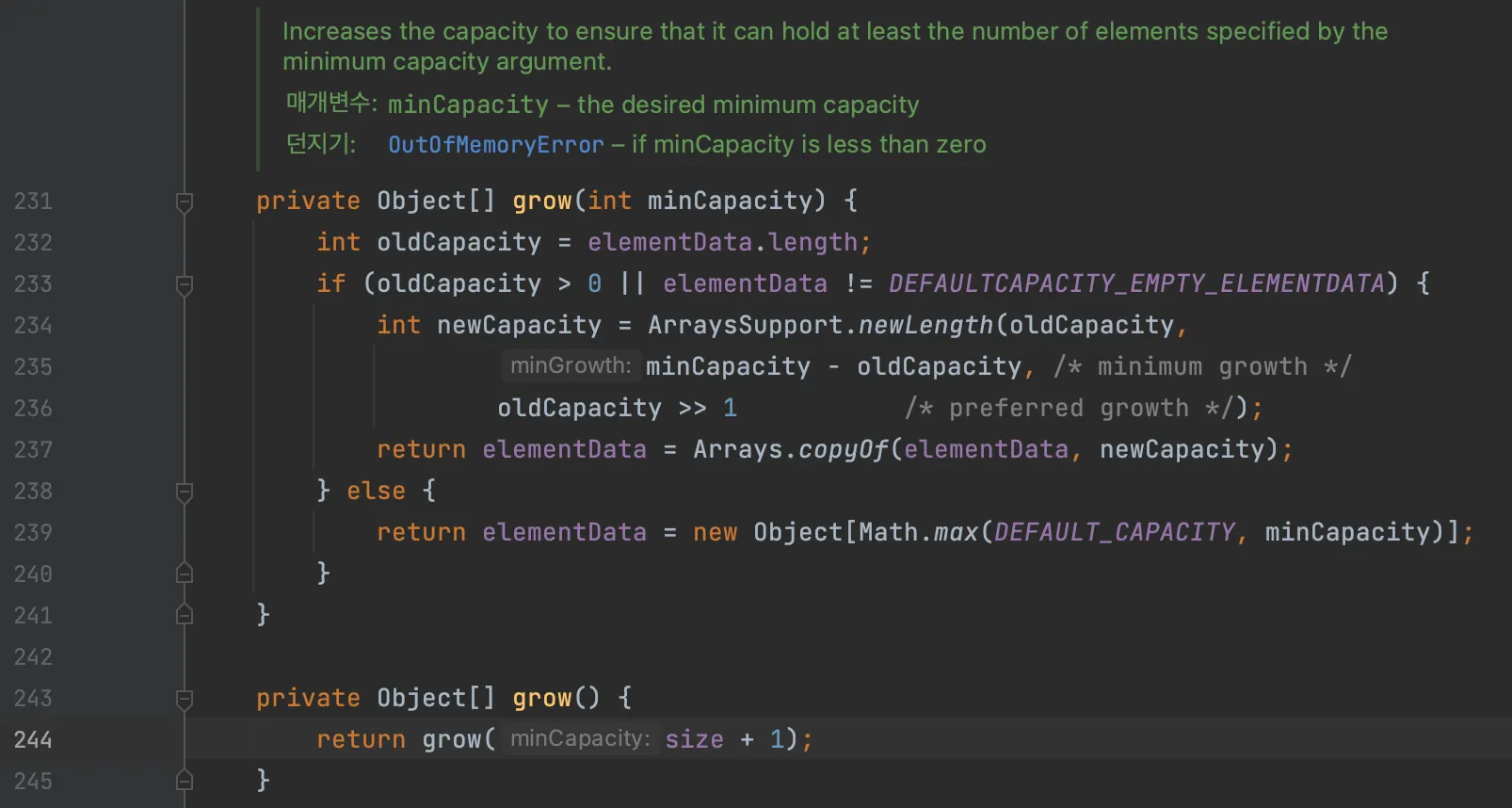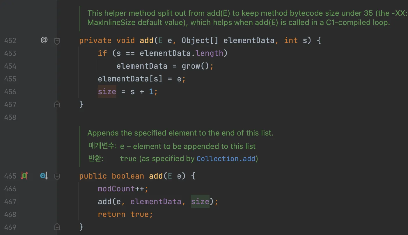 454 번째 라인을 보면, 리스트의 크기가 꽉 찼을 때, grow() 메서드를 호출한다. 이름에서 배열의 크기를 늘리는 메서드임을 추측할 수 있다.