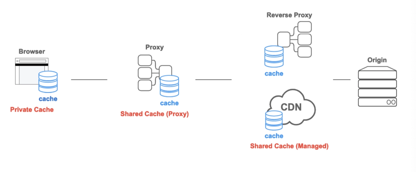 Shared Cache : 여러 클라이언트가 사용하는 캐시다. Origin 서버와 브라우저 사이에 존재한다.
