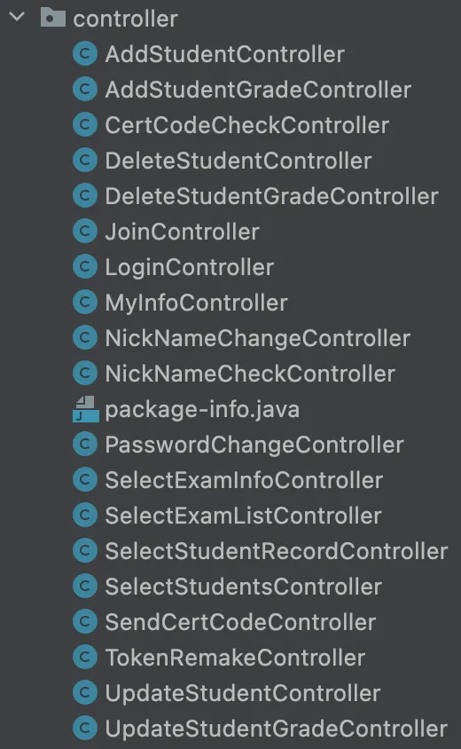 이전에 읽은 ⌜객체지향의 사실과 오해 : 역할 책임 협력 관점에서 본 객체지향⌟ 에서는 적절한 책임에 따라 객체에 역할을 부여해야 한다고 이야기 했다. 책임을 너무 많이 지게 해서도 안되지만, 책임을 너무 잘게 쪼개는 것도 지양해야 한다. 추후에 이 컨트롤러들을 핵심 도메인인 “선생님”, “학생”, “시험”, “성적” 단위로 묶는 것이 베스트일것 같다.