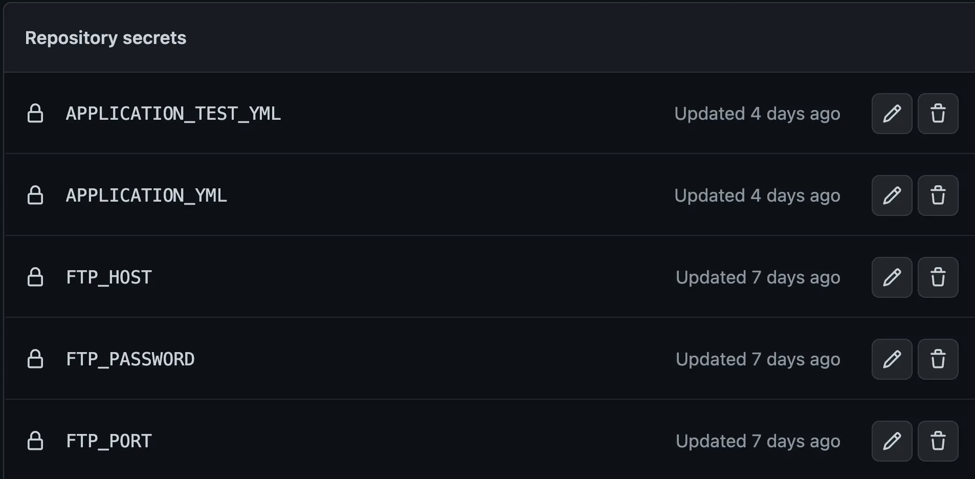 한번 등록한 Secrets의 삭제나 변경은 가능하지만 정작 조회가 불가능하다.. 즉, 제대로 동작하지 않았을 경우, 현재 어떤 값으로 등록되어있는지 알 방법이 없기 때문에 오류를 수정하기가 매우 어렵게 된다.
