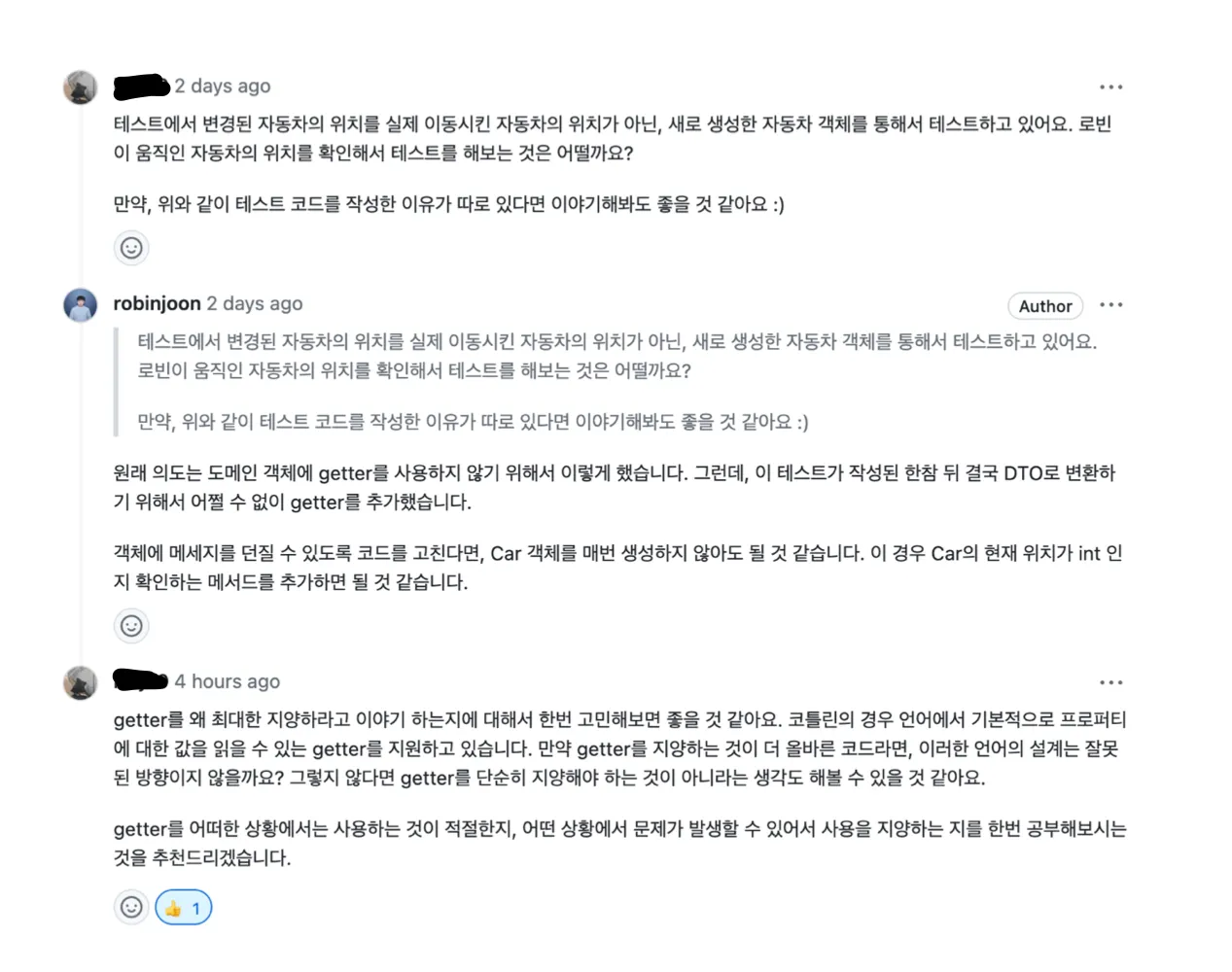 그리고 이 과정에서 기존의 객체에 메세지를 던지는 방식으로 도메인 로직을 구현한 메서드 중 하나인 Car.hasSameDistance(Car other) 메서드를 getter를 사용한 코드로 변경했다. 그랬더니 다음과 같은 리뷰가 달렸다.