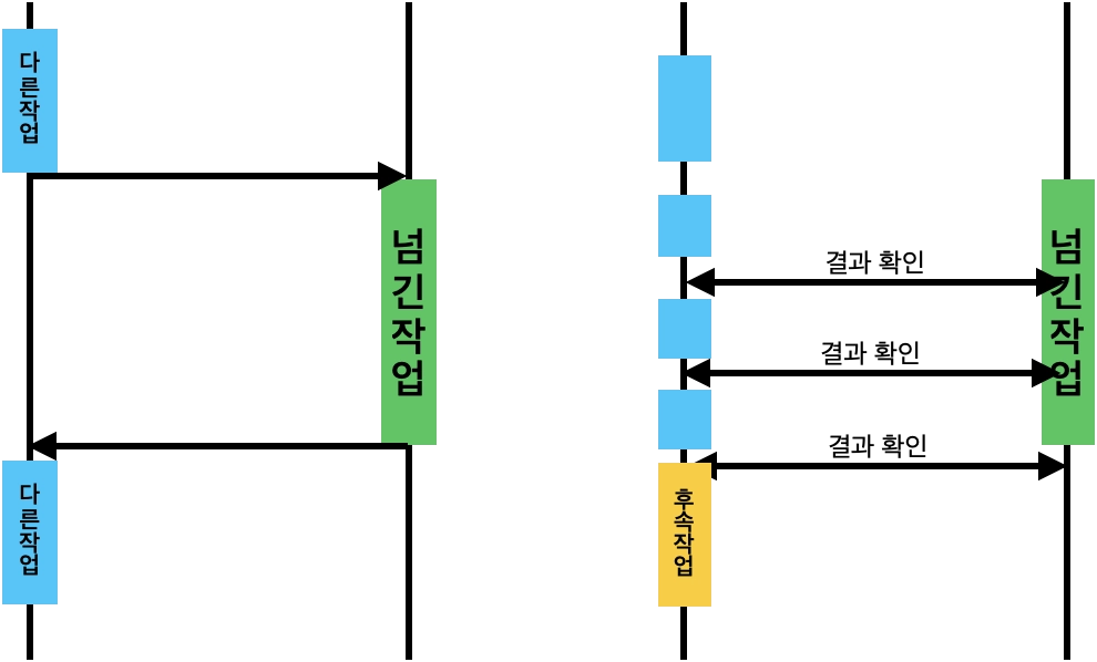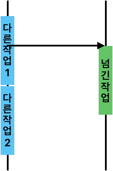 작업을 넘긴 주체가 결과를 기다리는 동안 다른 작업을 하는지 여부는 동기 비동기를 구분하는데 영향을 주지 않는다. 따라서 아래 두 도식은 모두 동기다.
